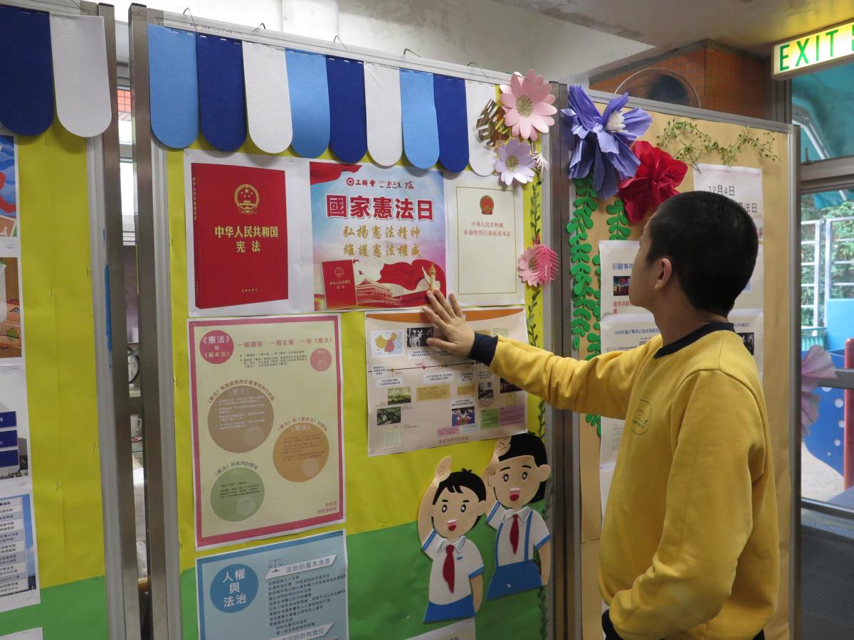 為迎接2025年12月4日「國家憲法日」,本校開展一系列教育活動,以增進全體教職員和學生對《憲法》、《基本法》及國家安全的認識。活動內容豐富多元,除舉行升旗禮及國旗下講話外,亦於有蓋操場設置「國家憲法日」專題展板,並配合教學短片播放及主題圖書閱讀等環節。